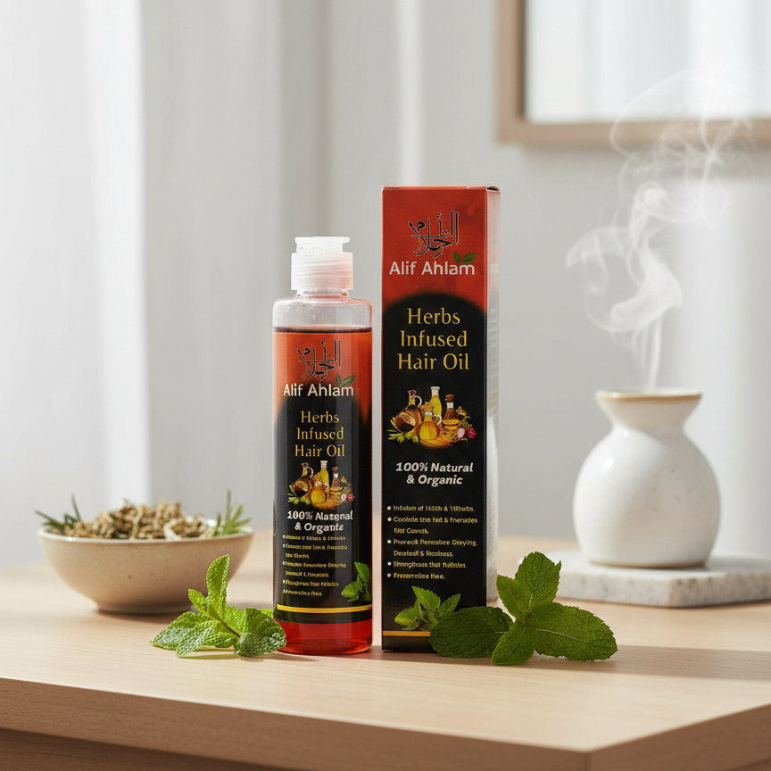 Alif Ahlam Pure Herbs Hair Oil is a natural care formula crafted with a blend of carefully selected herbs to support overall hair wellness. This nourishing oil helps strengthen hair roots, improve scalp health, and restore natural softness and shine. Regular use supports hair vitality, reduces dryness, and improves manageability without leaving a heavy or greasy feel. Suitable for all hair types, this herbal oil is ideal for daily or weekly hair care routines, promoting healthier, smoother, and more vibrant hair.Key FeaturesMade With Pure Herbal IngredientsNourishes Scalp And Strengthens Hair RootsPromotes Hair Vitality And WellnessHelps Improve Softness And Natural ShineSupports Healthy, Manageable HairNon-Sticky And Easy-To-Apply FormulaSuitable For All Hair TypesMade in China