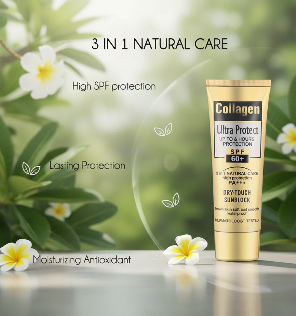 This advanced Collagen Ultra Protect Sunblock is a powerful daily defense solution, delivering SPF 60+ and PA+++ protection against the sun’s harsh UVA and UVB rays. Engineered for 3-in-1 Natural Care, it combines high-level sun protection with essential skincare benefits, making it an indispensable part of your routine.MADE IN CHINAKey Features & Benefits🛡️ High SPF Protection (SPF 60+ PA+++): Provides ultra protection, significantly reducing the risk of sun damage, premature aging, and dark spots. The PA+++ rating ensures robust defense against UVA rays, which penetrate deeper into the skin.⏳ Lasting Protection (Up to 8 Hours): The formula is designed for extended efficacy, offering protection that lasts for hours, even with a single application. Its waterproof quality ensures the shield remains intact through swimming or perspiration.💧 Moisturizing Antioxidant Care: Enriched with ingredients that offer essential moisture and antioxidant benefits. This not only keeps the skin soft and smooth but also helps combat free radicals, promoting healthier, more resilient skin.✨ Dry-Touch Formula: The sunblock applies smoothly and dries quickly to a comfortable, non-greasy, dry-touch finish, making it suitable for all skin types and for use under makeup.✅ Dermatologist Tested: Proven safe and effective, ensuring a gentle yet powerful sun care solution for your skin