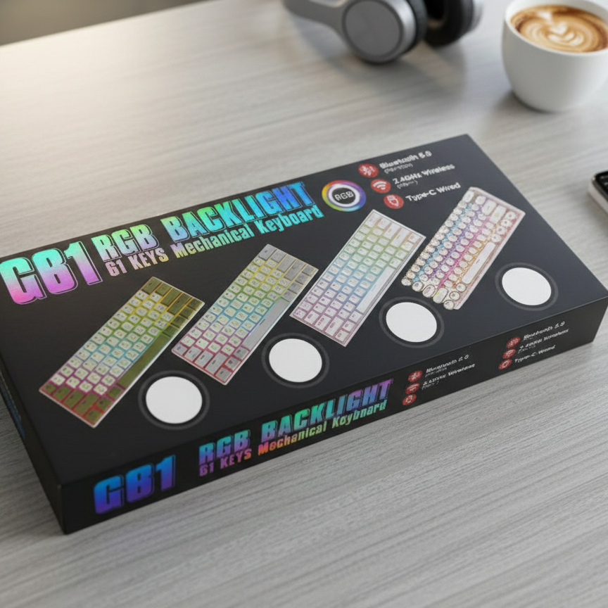 The GB1 RGB Mechanical Keyboard is engineered for those who demand more space without sacrificing power. By adopting a 61-key compact layout, it frees up vital desk real estate for sweeping mouse movements, making it an essential tool for FPS gamers and minimalist enthusiasts alike.Crafted with versatility in mind, the GB1 offers Triple-Mode Connectivity. Whether you prefer the ultra-low latency of 2.4GHz wireless, the multi-device convenience of Bluetooth 5.0, or the reliability of a USB-C wired connection, the GB1 adapts to your workflow. The high-density mechanical switches provide tactile precision and a satisfying click, while the fully customizable RGB backlighting breathes life into your setup with millions of color combinations. Built with a durable chassis and long-lasting battery life, the GB1 is ready for grueling gaming sessions and long workdays.Key Features & ResponsibilitiesSpace-Saving 60% Layout: Removes the numpad and function row to provide a compact, ergonomic design that reduces wrist strain and maximizes desk space.Triple-Mode Versatility: Seamlessly toggle between three connection methods—2.4GHz Wireless, Bluetooth 5.0 (connect up to 3 devices), and Type-C Wired mode.Dynamic RGB Lighting: Features multiple pre-set lighting modes and customizable per-key brightness levels to match your aesthetic.High-Performance Mechanical Switches: Designed for rapid-fire input and tactile feedback, ensuring every keystroke is registered with pinpoint accuracy.Universal Compatibility: Works out of the box with Windows, macOS, Android, and iOS, allowing for a fluid transition between your PC, tablet, and phone.Long-Lasting Battery Life: Equipped with an internal rechargeable battery designed to last for days of wireless use on a single charge.