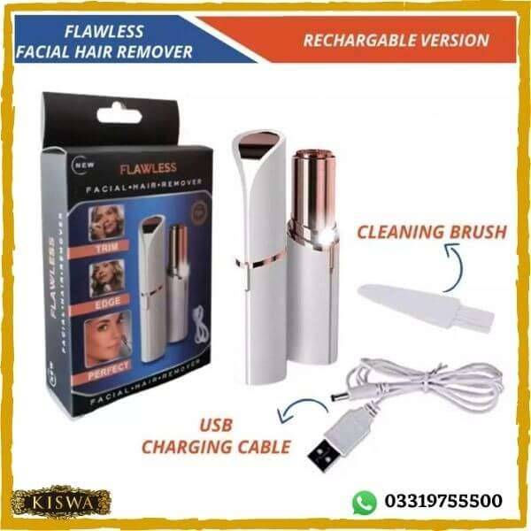 USB Rechargeable Flawless Facial Hair Remover OriginalPainless Hair Remover for Women’s – USB Flawless Hair Remover Machine – Rechargeable Flawless Hair Removal with Battery IncludedFlawless Facial Hair Remover with USB Cable airs.The unit should not be on an angle. Precede making small circular motions to remove unwanted hair.Flawless Facial Hair Remover very easy to use just switch ON the light automatically turn on.Trimmer pen has painless hair remover, with no nicks or irritation.It can be used for unwanted hair and results are 10 times more effective than wax, razor, hair removal spray, and hair removal wipes.Product Highlights:Painless Experience: Trimmer pen has painless hair remover, with no nicks or irritation.Say goodbye to waxing and plucking: A new women’s facial hair remover machine that erases hair microscopically, without pain and irritation associated with waxing, plucking or depilatories.Clean and smooth skin: New German technology which removes hair infinitesimally so never miss a single hair from cheeks, upper lips, chin and eyebrows etc.For all types of skin: Flawless facial hair remover device is hypoallergenic and gentle on any type of soft skin. So it never creates redness after use.No Irritation and Burns: No nicks, burns, or irritation generally caused by tweezers and blades.Portable and compact design product.Finishing Touch Flawless facial hair remover is a Portable design. Sleek and compact design lets you handle with absolute control and precision.Easy to Operate:The light will automatically turn on when the unit is “ON”.Pull the skin tight and move the unit in small, circular motions or from side to side.You may have to go over the same area several times to achieve the best results.Clean after use:Clean the face razors with a free attached brush.Note: Do not rinse the trimmer head underwater.
