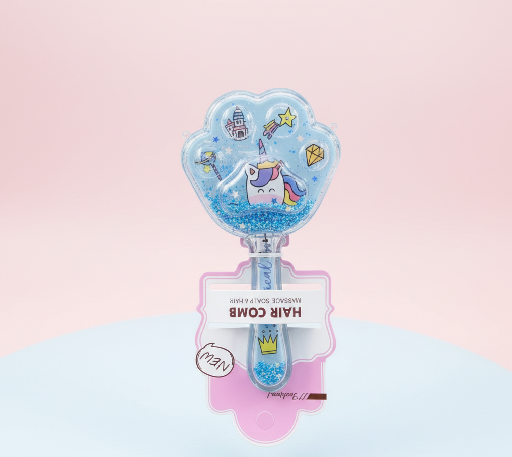Bring a touch of magic to your daily grooming routine with this “Magical” Unicorn Hair Comb. Shaped like a cute animal paw, this brush features a transparent, liquid-filled back filled with swirling blue glitter, stars, and charming icons like castles and gems. At its center sits a colorful crowned unicorn, creating a captivating visual experience with every movement.Beyond its enchanting appearance, the brush is engineered for comfort and functionality. The ergonomic handle is easy for smaller hands to grip, while the flexible bristles are designed to glide through knots without tugging. Whether used on wet or dry hair, it serves as both a practical detangler and a relaxing scalp massager, turning hair care into a fun, sensory activity.Key ResponsibilitiesGentle Detangling: Smoothly navigates through various hair types to remove tangles with minimal breakage or discomfort.Scalp Stimulation: Provides a soft massage to the scalp and hair follicles, helping to distribute natural oils and promote relaxation.Sensory Engagement: Features a “shake-to-move” glitter back that provides visual entertainment and a calming sensory experience for users.Ergonomic Handling: Offers a lightweight, compact design that fits comfortably in the palm or a travel bag for on-the-go styling.Durability: Protects the internal liquid and glitter decorative elements with a thick, shatter-resistant transparent casing.