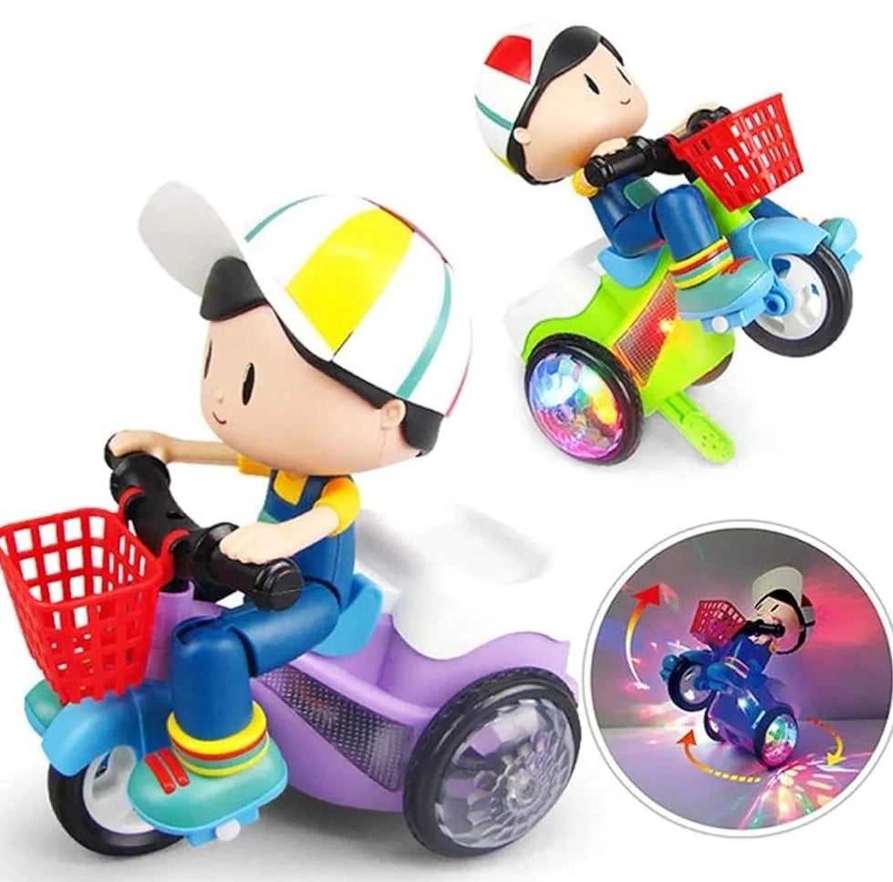 The Musical Stunt Tricycle Toy Bike is an exciting toy for kids featuring 360-degree rotation, colorful 3D flashing lights, and cheerful music. With bump and go action, it keeps children entertained while adding fun movement and effects.Key Points:360° rotation for stunt actionColorful 3D flashing lights for visual funMusic feature adds excitementBump and go action for continuous playMulticolor design suitable for kids