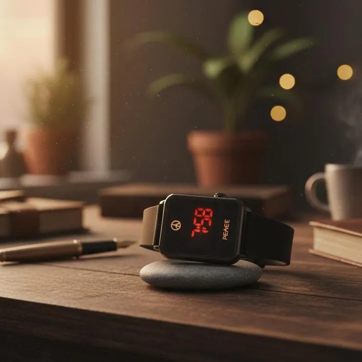 Elevate your daily ritual with a timepiece designed for clarity and calm. The PEACE LED Digital Watch is more than just a tool for keeping time; it is a statement piece for the modern minimalist.The watch features a bold, high-contrast red LED display that remains hidden until activated, ensuring a clean, seamless look. Housed in a durable obsidian-black casing and paired with a soft-touch premium silicone strap, it offers unparalleled comfort for all-day wear. Whether you are in a high-stakes meeting or enjoying a quiet moment of reflection, the “PEACE” branding serves as a subtle reminder to stay grounded in the present moment.Key Responsibilities (Product Features)To ensure the best user experience, this timepiece is designed to handle the following:Precision Timekeeping: Delivers highly accurate digital quartz movement for reliable daily scheduling.Intuitive Interface: Simplified single-button or touch-activation to cycle through time, date, and seconds.Visual Clarity: Employs a high-luminance red LED matrix that ensures readability in low-light and outdoor environments.Durability & Protection: Provides a water-resistant seal and scratch-resistant face to protect against everyday wear and tear.Ergonomic Comfort: The adjustable, hypoallergenic strap is engineered to reduce skin irritation and provide a secure fit for all wrist sizes.