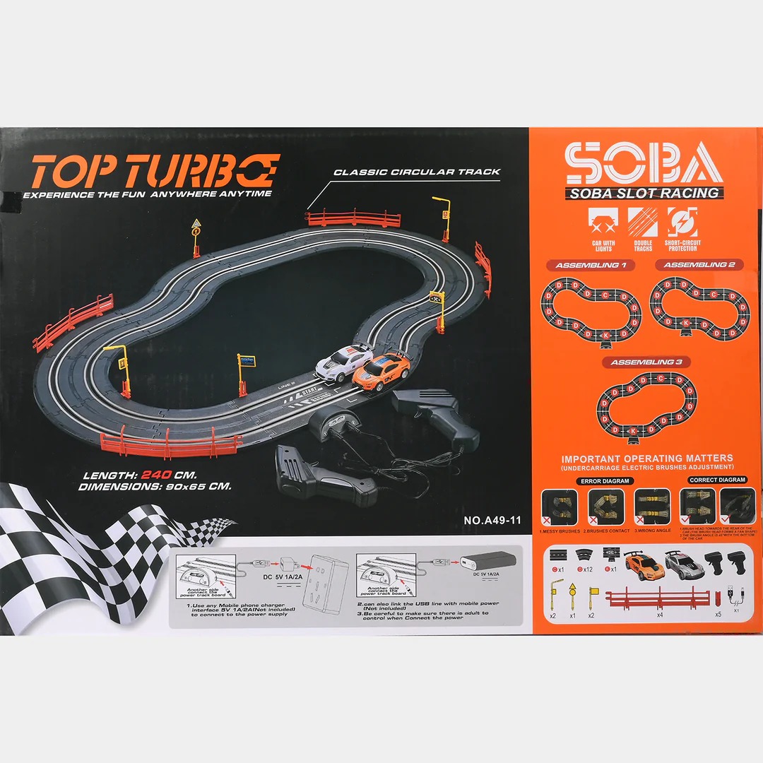 Push the limits of speed and precision with the Soba Top Turbo 1:43 Scale Slot Car Racing Set. Engineered for enthusiasts who demand more than just a toy, this set brings the atmosphere of the grand prix into your living room.The heart of the Soba Top Turbo experience lies in its aerodynamic vehicle design and enhanced magnetic downforce, allowing cars to hug the corners at speeds that would send lesser models flying. The track system is built for durability and easy assembly, featuring a mix of high-speed straights, challenging hairpins, and elevation changes that test a driver’s nerve and timing.Equipped with ergonomic “Turbo Boost” controllers, players have granular control over their speed, allowing for tactical braking and explosive overtaking maneuvers. Whether you are a veteran racer or a newcomer looking for high-octane excitement, the Soba Top Turbo set offers a seamless blend of performance, durability, and pure competitive fun.Key Responsibilities (of the Player/Racer)As a driver in the Soba Top Turbo circuit, your success depends on mastering these core elements:Throttle Management: Balancing raw speed with precision braking to navigate tight corners without losing traction or “de-slotting.”Strategic Turbo Deployment: Utilizing the Turbo Boost function on long straights to overtake opponents while ensuring the car remains stable entering the next turn.Pit-Ready Maintenance: Keeping the vehicle’s contact brushes clean and properly adjusted to ensure consistent electrical flow and peak performance.Track Calibration: Monitoring track connections and cleanliness to prevent power drops during critical moments of the race.Tactical Awareness: Observing opponent patterns and choosing the optimal moment to accelerate or defend your position on the lane.